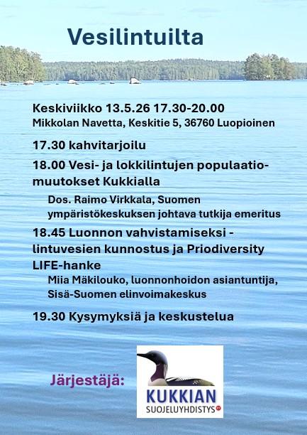 Hyvät Kukkian ystävät, Kevät on päässyt hyvään alkuun, ensimmäiset sinivuokot ovat pistäneet päänsä esiin ja osa järven linnuista palannut muuttomatkoiltaan. Vähälumisen talven jälkeen vesi on…
